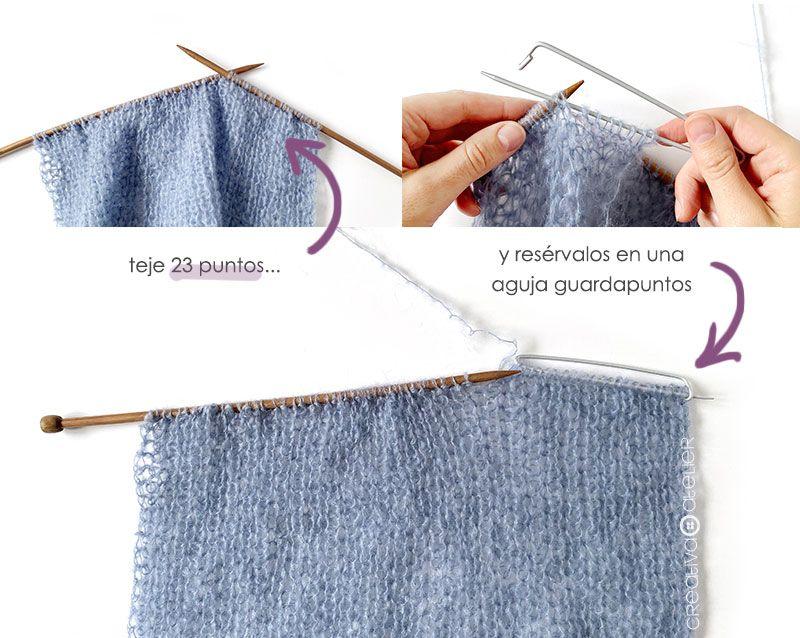 En este punto, dividiremos nuestra labor y separaremos puntos para formar cada uno de los delanteros y la base de la nuca. Para ello, teje 23 puntos (correspondientes a un delantero) y resérvalos en una aguja guardapuntos.