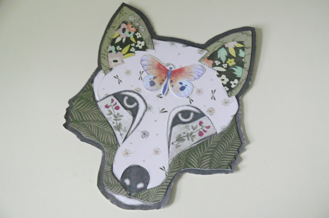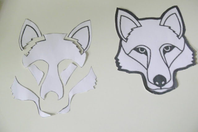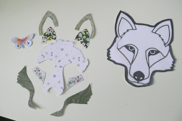 He creado una careta de lobo y otra careta de elefante con cartulinas y unas simples tijeras. La máscara del lobo está hecha a partir de cartulinas con estampados vegetales de diferentes tonos porque buscaba un estilo onírico y romántico.