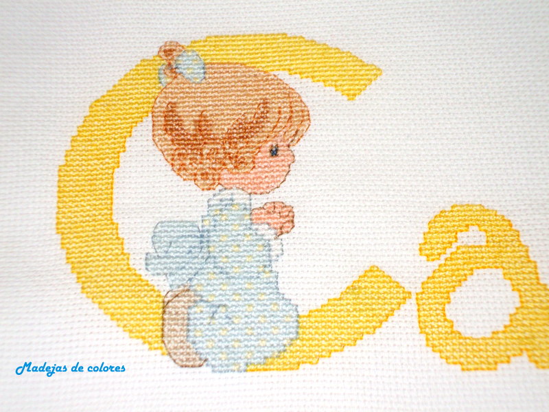 Una vez más con un diseño de "Precious Moments", se trata de una niña preparada para dormir con su pijama celeste con topitos amarillos, de rodillas rezando sus oraciones.