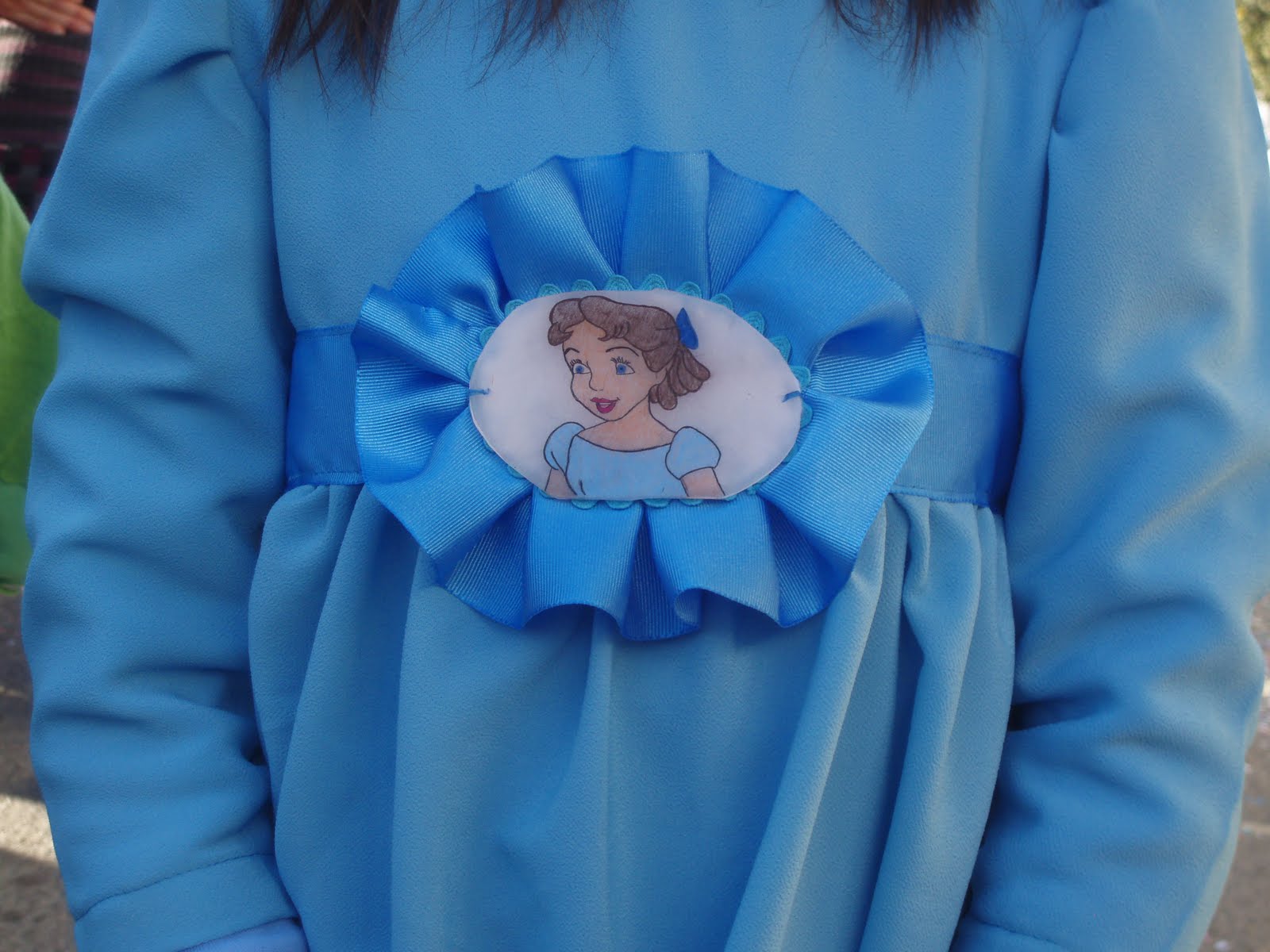 Mi Wendy, esta especialmente guapa, pues el color le favorece un montón. La tela era un viejo retal de crespón, y no daba para mucho, pero pudimos hacer el camisón de la amiga de Peter Pan. Va cortado debajo del pecho, y la falda va fruncida. En la espalda le puse un velcro y un gran lazote.