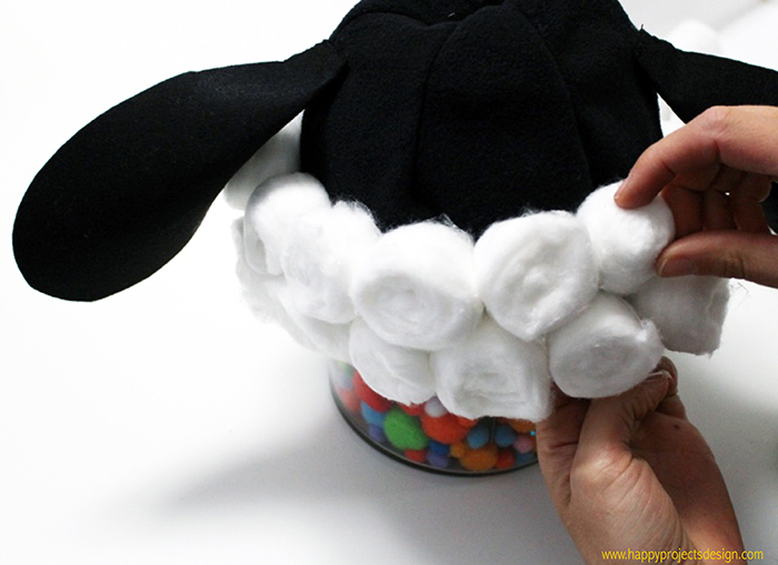 Con la pistola de silicona caliente pega las bolas de algodón hasta cubrir todo el gorro.