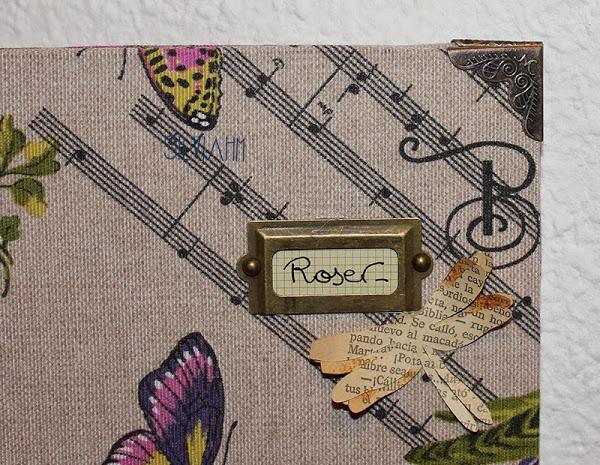 N. quería regalársela a Roser. Como siempre, me gusta que me déis vuestra opinión, especialmente cuando va a ser un regalo, para que sea lo más personal posible. Así, elegimos esta tela que me encanta!!!, una chapita metálica con su nombre, que realza el aire vintage que queríamos darle.