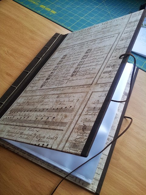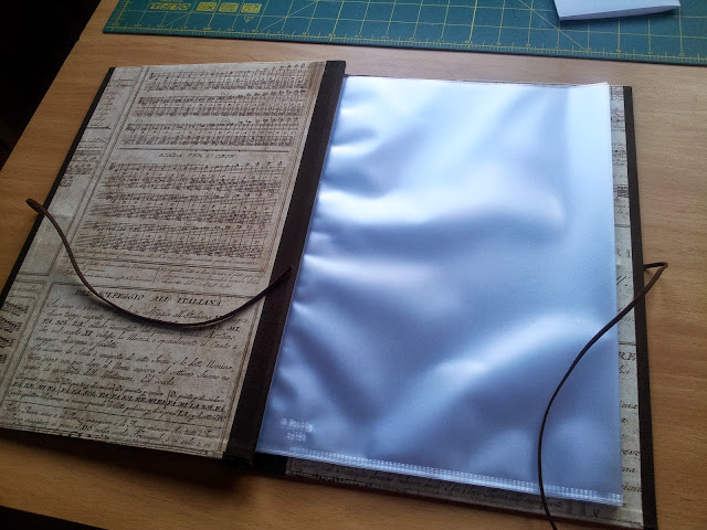 Totalmente personalizado, interior cuerpo 30 pg. con fundas para partituras y cierre en Antelina. Papel Tassotti temática música y lomo con cosido japonés. Y conjunto de bolígrafo y lápiz a juego con la portada. Eva eligió esta carpeta a su gusto, para hacer un regalo a Paula. (Aunque esta dando vueltas en correos y aun no ha llegado a su destino) Gracias por tu paciencia Eva. Si quieres la tu ...