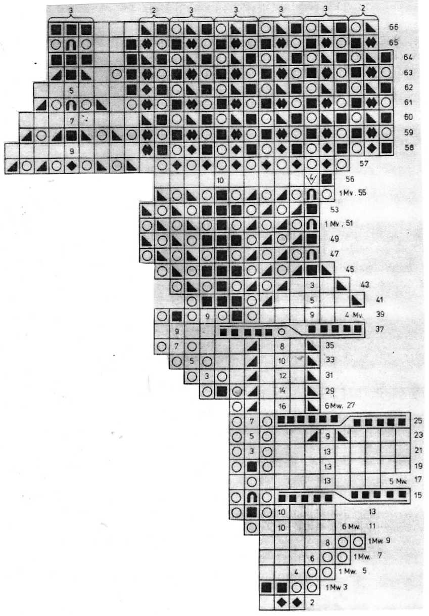 Desde la 41º vuelta cerrada , tejer 16 veces el esquema. Desde la 55º vuelta cerrada tejer segun el gráfico.