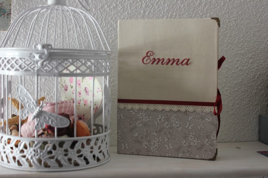 Forradas en tela, con el nombre bordado en SINGER en un lino color arena, rematadas con puntillas y lazo grande.