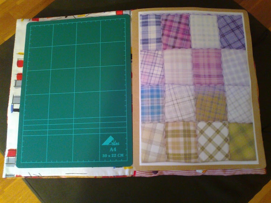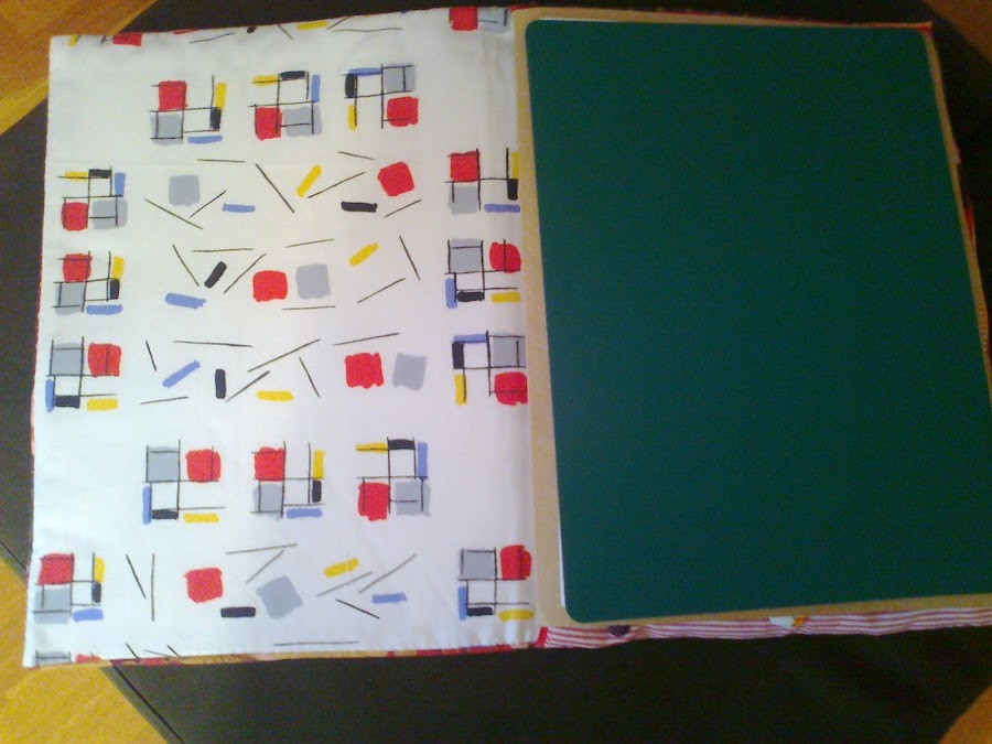 volvemos a pasar "hoja" y tenemos una" mini placa de plancha" para poder planchas esas costuritas pequeñas que las que hacemos patch, sabemos que siempre hay que ir planchando y es un engorro, montar y desmontar la tabla de planchar.Le he puesto cartón duro,doble grueso de guata una lámina de papel de aluminio (he leido que multiplica el calor)otra capa de guata y finalmente un trozo de tela de algodón, todo ello sujeto a la tapa de nuestra carpeta. !Y ya está, a punto para usar!