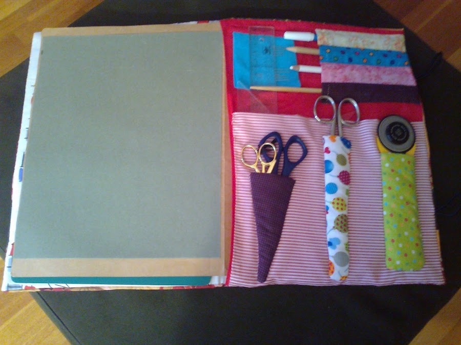 En la cara de la derecha he cosido un gran bolsillo donde he puesto las reglas,escuadras y cinta métrica,encima los porta-tijeras y cuter unos bolsillitos para lápices,rotulador de agua,pinchito para ayudar a voltear esquinas,etc. y lápiz marcador de yeso, ahora veo que falta el bolsillito para dedales (que ya lo he añadido) y cuadradito de 4 hojas de fieltro para agujas y alfileres.
