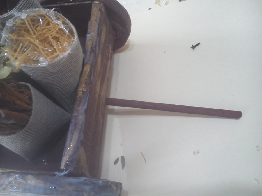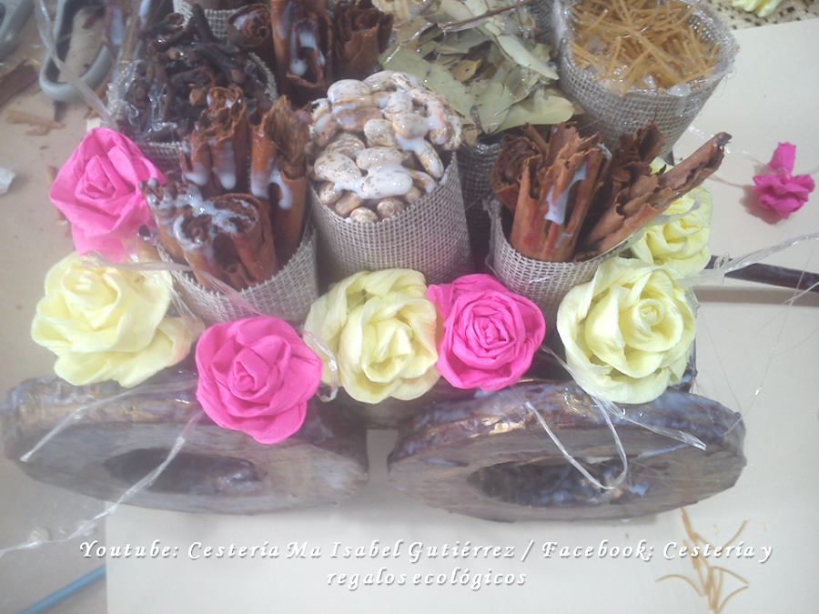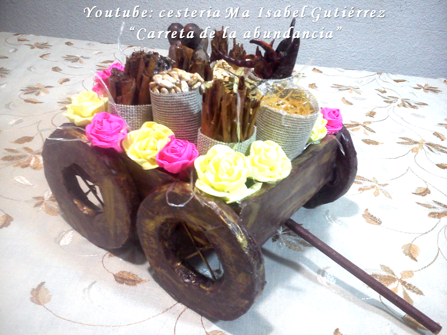 Rellenamos los espacios que quedan en la carreta, alrededor de los sacos, con flores, éstas son de papel crepé... y para finalizar nuestro trabajo, aplicamos una capa generosa de barniz transparente a toda la pieza, incluídos los sacos...