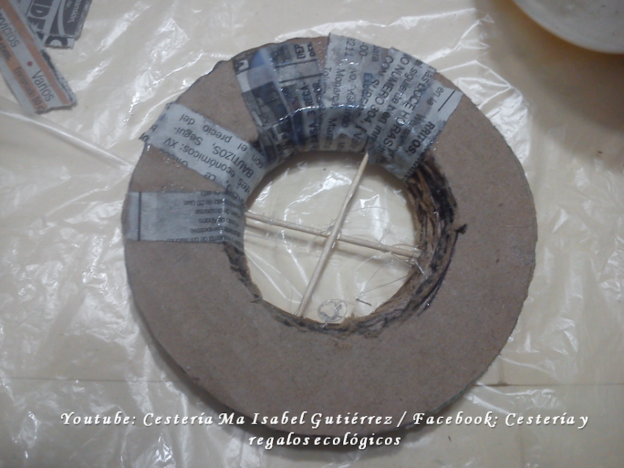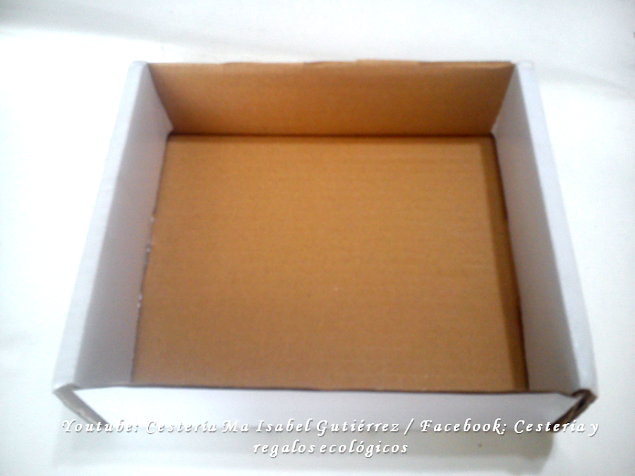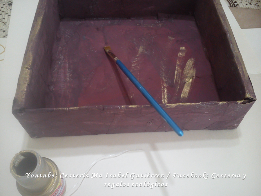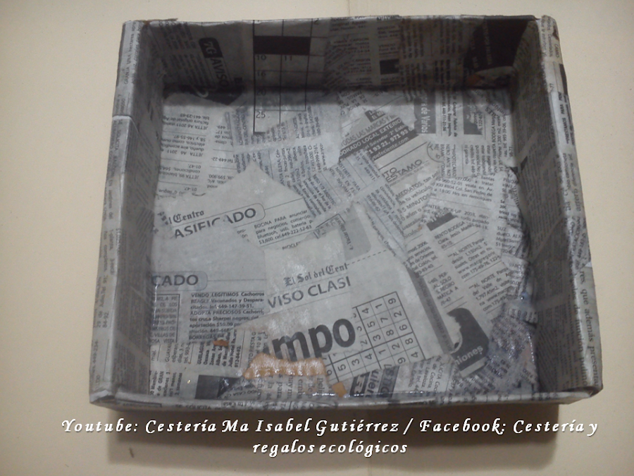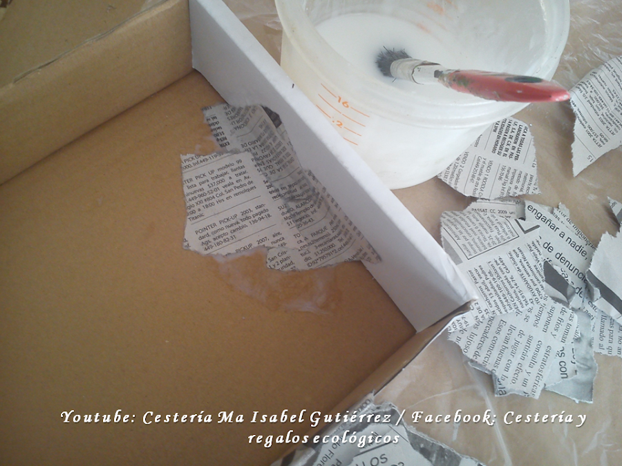 Aplicamos dos capas de cartapesta a la caja. La cartapesta consiste en pegar pequeños pedazos de papel que son cortados con nuestras manos, no con tijeras, con una combinación muy aguada de pegamento o cola blanca y agua...