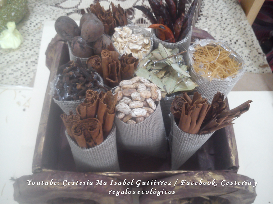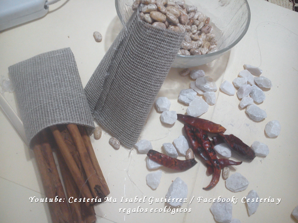 Rellenamos los saquitos con granos secos o especias, yo le puse un poco de frijol, chiles secos, canelas, avena y hojas de laurel. Para no ocupar mucho de estos granos, rellené el fondo de los sacos con piedras pequeñas... cuando hayas rellenado hasta el tope, ponemos un poco de silicón para que los granos y especias se mantengan fijas...