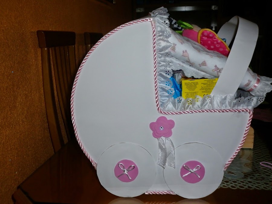Este carricoche tan bonito está hecho para regalar a una mamá que acaba de tener una preciosa niña. Dentro lleva un montón de cosas para un recién nacido, incluido pañales. Muy original para regalar. Espero que os guste.