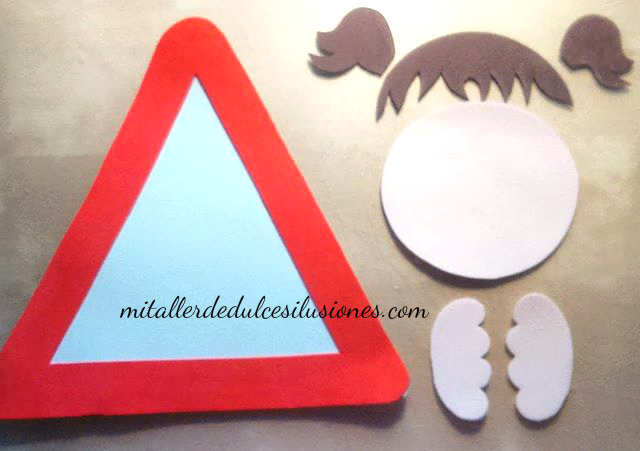 Por la parte de atrás del triángulo blanco pegamos las piernas que asomaran por los lados de la señal, como truco:los zapatos los hice usando como moldes los pies y decoré a mi gusto.
