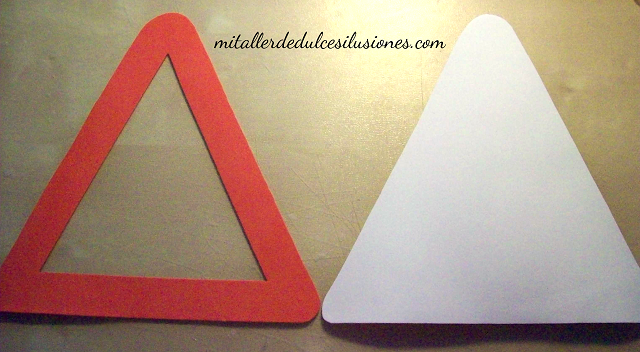 3. En cuanto a las medidas de nuestro triángulo podéis hacerlo de las que queráis,en mi caso son 25 cm de ancho x 30cm de alto ,hacéis un triángulo con una regla en vuestra goma eva de color rojo,yo he hecho dos triángulos iguales de color rojo,,porque uno de ellos lo usaré de base para que quede más reforzado y otro de las mismas medidas en la goma eva de color blanco.En uno de los triángulos de color rojo recortaremos el interior,dejando sólo el borde del triángulo ,para que asi parezca una señal de tráfico,el grosor del borde un par de cm por lo menos y lo recortáis con cuter que es como mejor os quedará.
