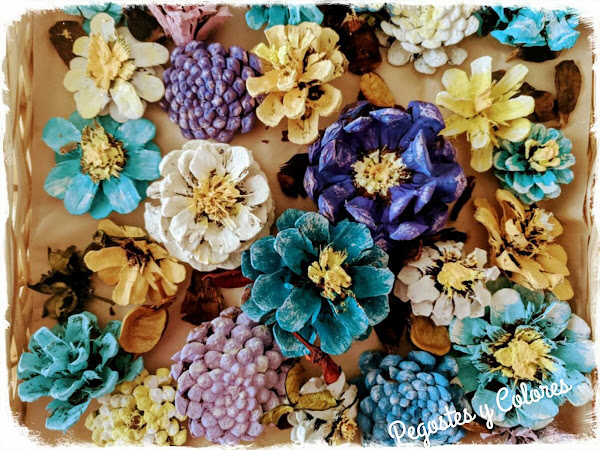 Procedimiento:1.- Para no repetirme, revisa la entrada de Corona Rustica con Flores de Piñas, ahí explico el proceso para partirlas y pintarlas. Para este trabajo use colores muy pastel en tonos amarillo, durazno, rosa, lila, blanco, crema, azul turquesa y amarillo canario en los centros de las flores.