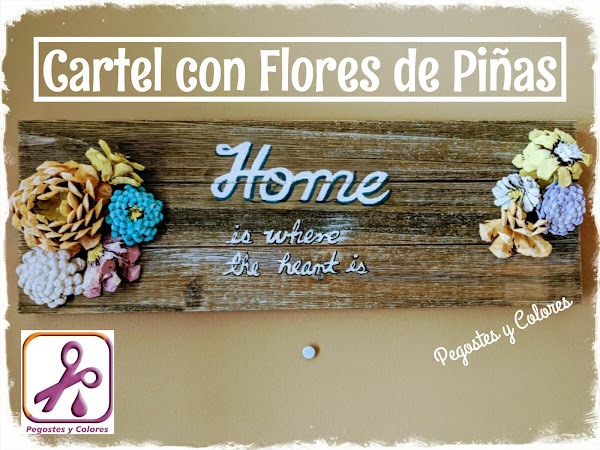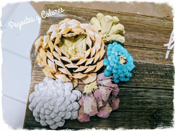 Bueno pues como habia prometido, aqui esta un trabajo mas hecho con las piñas partidas semejando flores. Como ya explique en la entrada de Corona Rustica con Flores de Piñas el proceso, solo veremos de forma rápida lo que hice con las que me sobraron.Me gustaron las flores, como para usarlas en un cartel de entrada en la casa. Al principio me dio mucha lastima las piñas que se quebraron mucho al intentar partirlas pero... Resulto que algunas semejan a la flor vista de otra perspectiva, como si la viéramos de lado con el centro hacia arriba y los pétalos hacia abajo como las margaritas. Y así, juntando de las mas bonitas con algunas que a primera vista hubiera tirado, forme un par de composiciones con ellas para adornar un cartel.