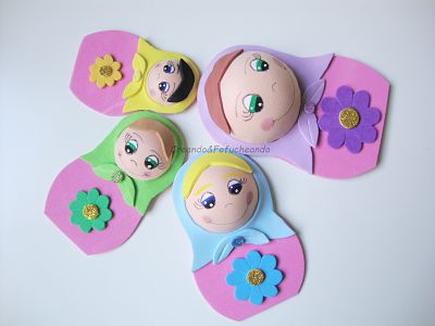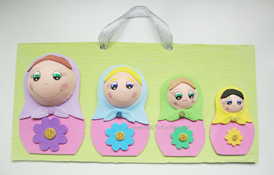 Te presento a mis Fofuchas Matrioskas. 4 amigas de Goma eva que he hecho de manera plana y que he colocado en un cartelito para decorar una habitación o el rincón que queramos de nuestro hogar.