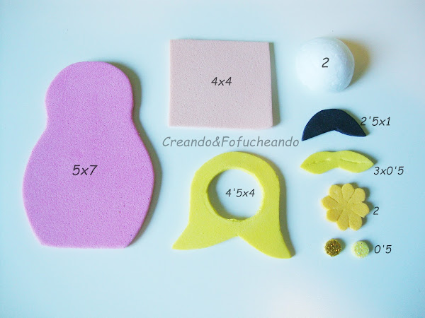 Lo primero que haremos será coger los cuerpos tipazo totales tipo bolos,jajaja,que habremos recortao en el color de Goma eva que queramos. En mi caso en rosa.
