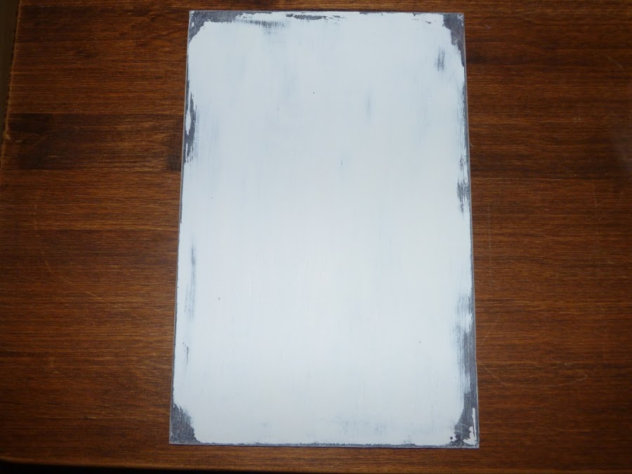 Primero, preparé la tabla, pintándola con chalk paint blanca y haciéndole un decapado bastante marcado en los bordes: