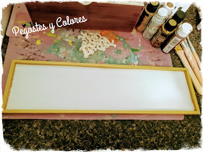 Procedimiento:1.- Primero una lijada ligera a la base de cartel y una limpiada con un paño. Luego una mano de pintura blanca chalk al fondo, dejar secar. Luego una mano de dorado a toda la orilla del marco, deje secar.