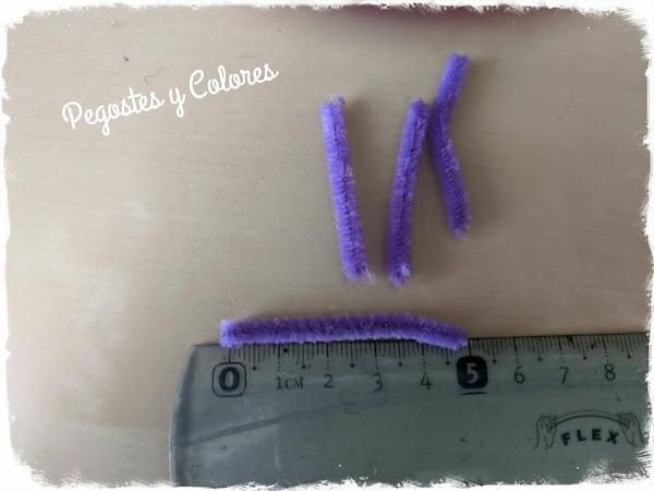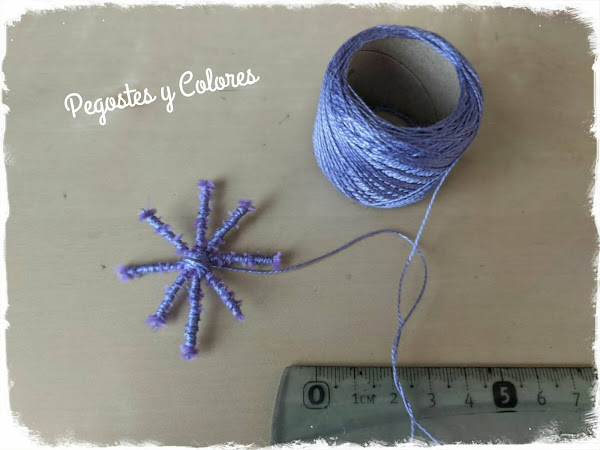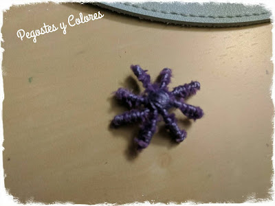 9.- Hice una arana, cortando 4 trozos de limpia pipas morado de 5 cm, los uni por el centro y enrolle con hilo perle de tono similar. Usando el mismo hilo envolvi las patas enredandolas.