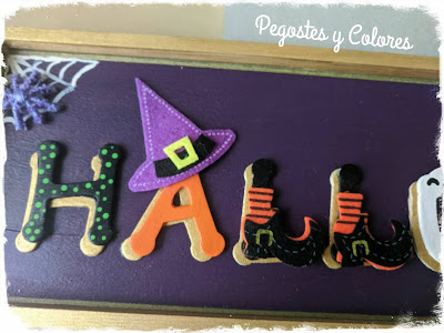 A la letra "A" le pegamos una pegatina de fieltro en forma de sombrero, a cada letra "L" piernas de bruja con sus medias y zapatos.