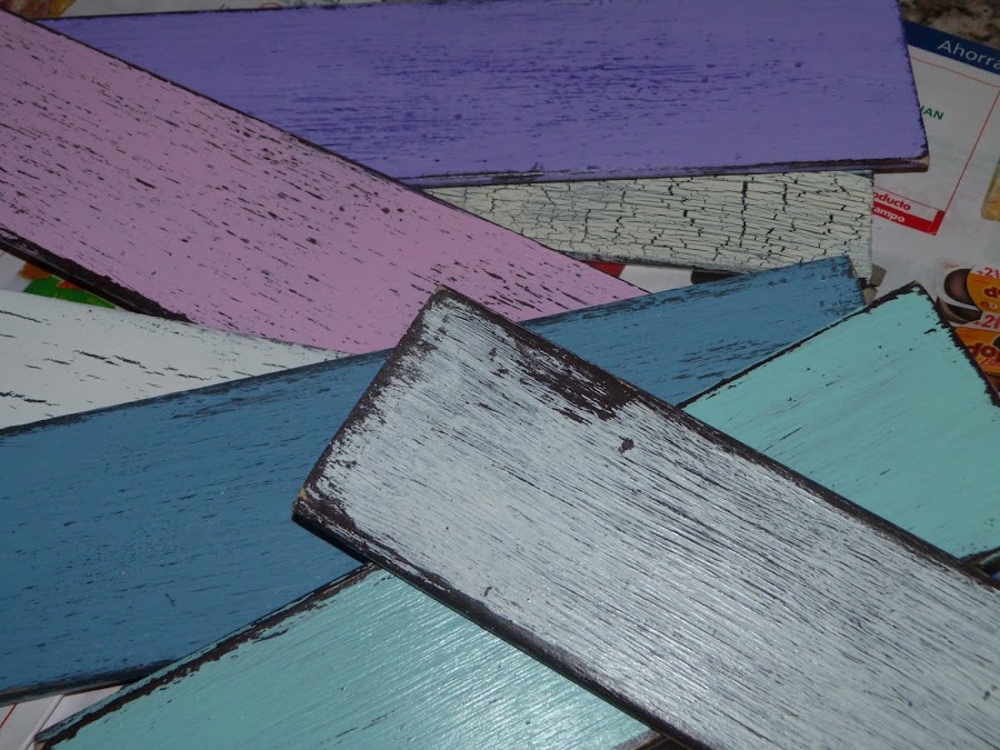 Después, pasé una vela por los bordes y esquinas y apliqué craquelador a dos de ellas. Por último, como preparación de las maderas, las pinté en tonos pastel, las lijé y las barnicé con barniz mate.