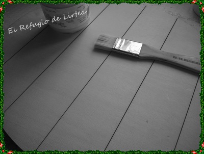 Una vez pintado de blanco y secada la pintura, lijamos suavemente y con un pincel de starcir y pintura en color marrón hago un resalto de las divisiones de los listones que trae el soporte, quiero que se noten un poco tras el papel de arroz.