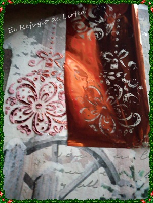 Cuando está mordiente el mixtión se aplica la lámina del foil, se presiona con los dedos y se retira quedando todo el relieve cubierto por el color del foil que hemos elegido, en mi caso color plata y bronce. Intercambio stencils en relieve con stencil pintados.