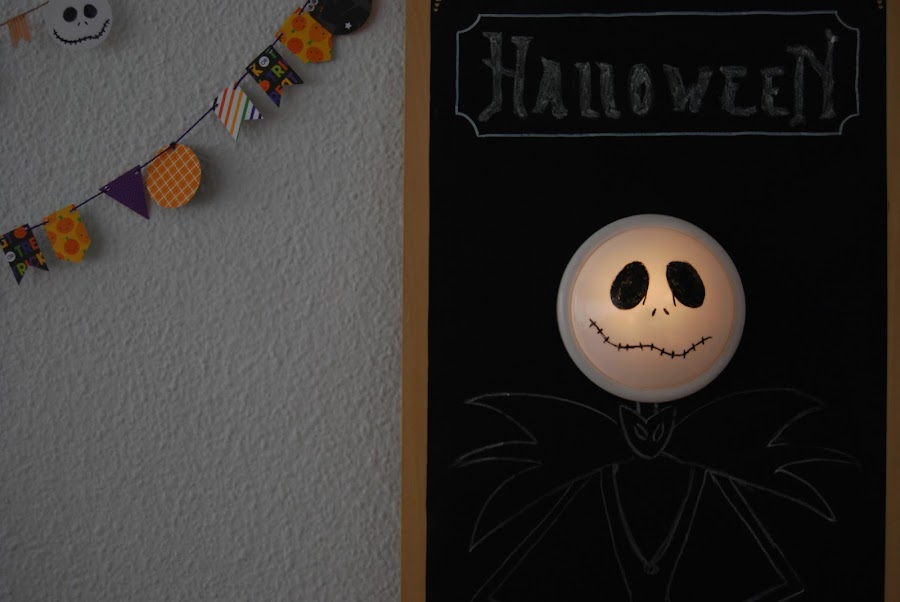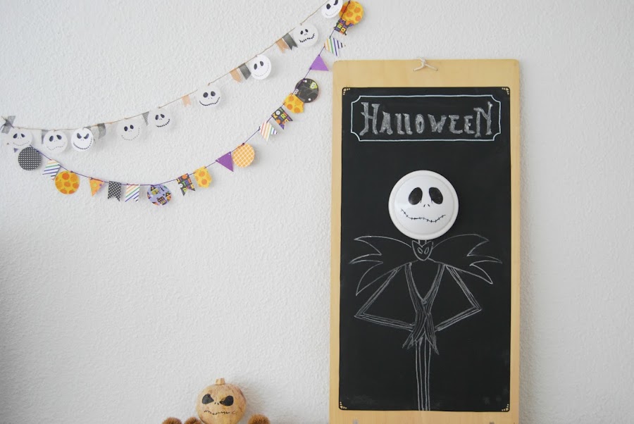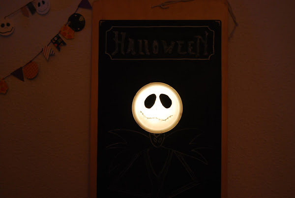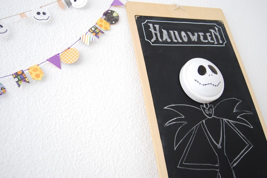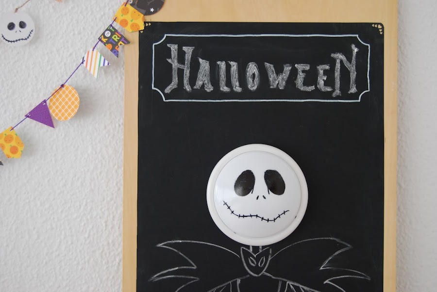 Hoy para completar la decoración, he preparado una pizarra (muy fácil como siempre), con la cara de Jack. Además de la pizarra y tizas, sólo necesitaréis una de esas luces de pulsar que venden en cualquier ferretería y un rotulador permanente negro.