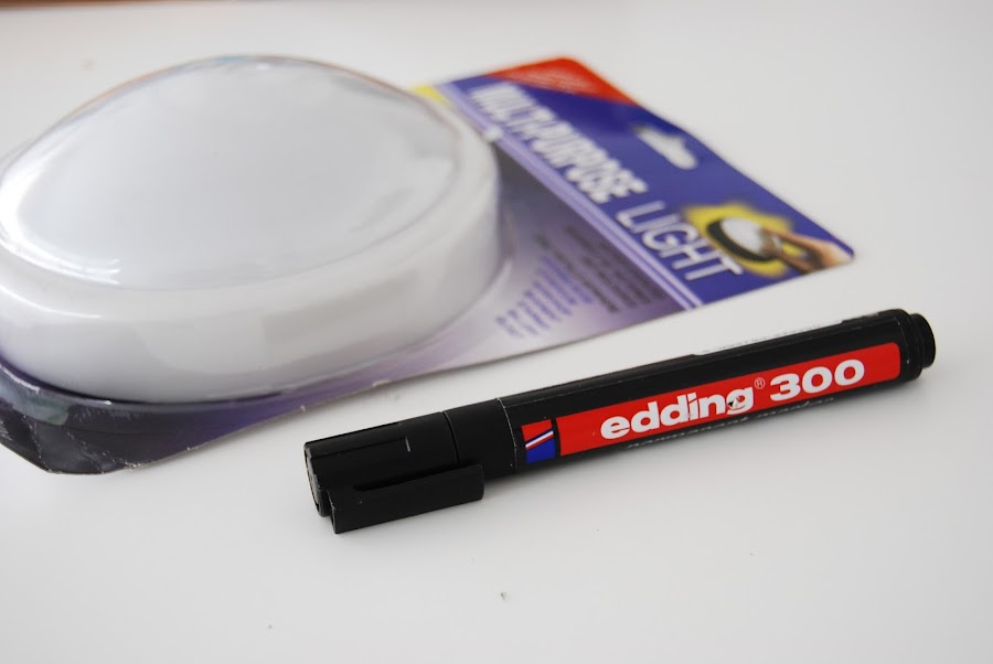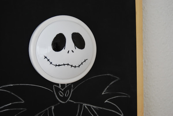 Pintamos la cara de Jack en la lámpara y dejamos que seque el rotulador para pegarla (yo lo he hecho con esa pasta para pegar posters) en la pizarra.