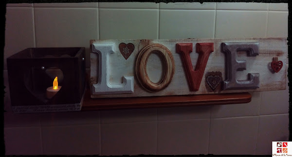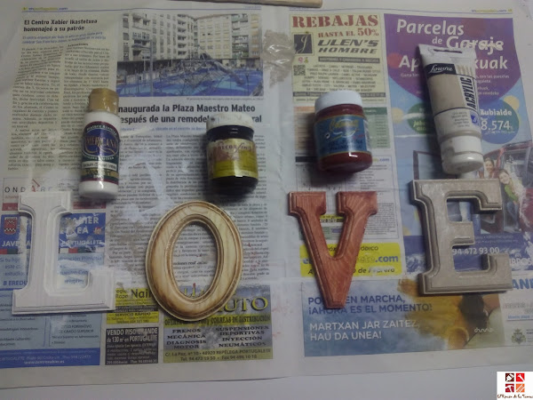 Ahora vamos con las letras, son de madera natural y cada una está pintada de un color, la L acrílica blanca, la O con la misma patina que la tabla , la V la he dado una patina tono oxido y la E acrílica color lino.