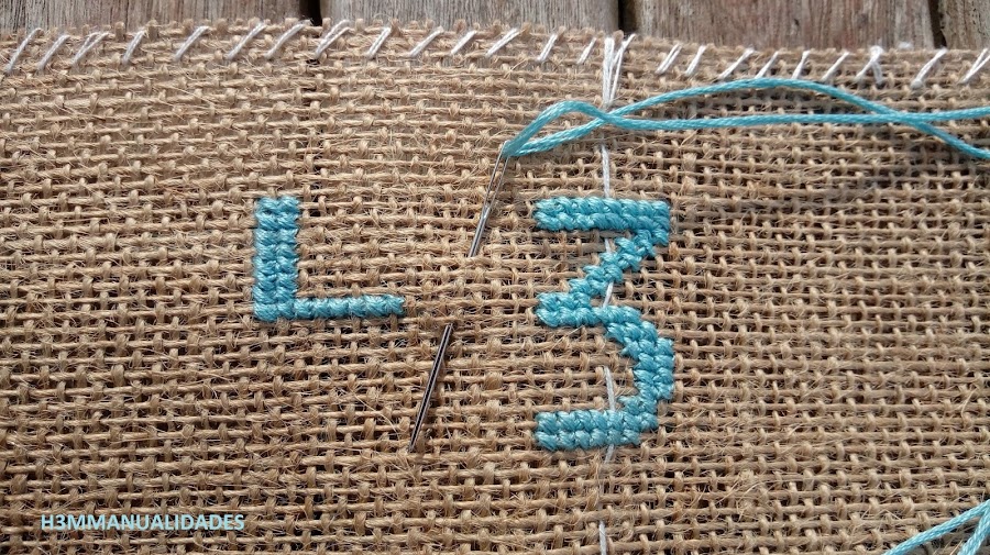 Inicialmente hice todo en azul, pero me parecía que no iba a resaltar ni a verse de lejos, que es de lo que se trata... Así que me decidí por rodear todo con bordado en blanco (esto alargó el trabajo, pero contenta!)