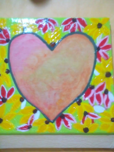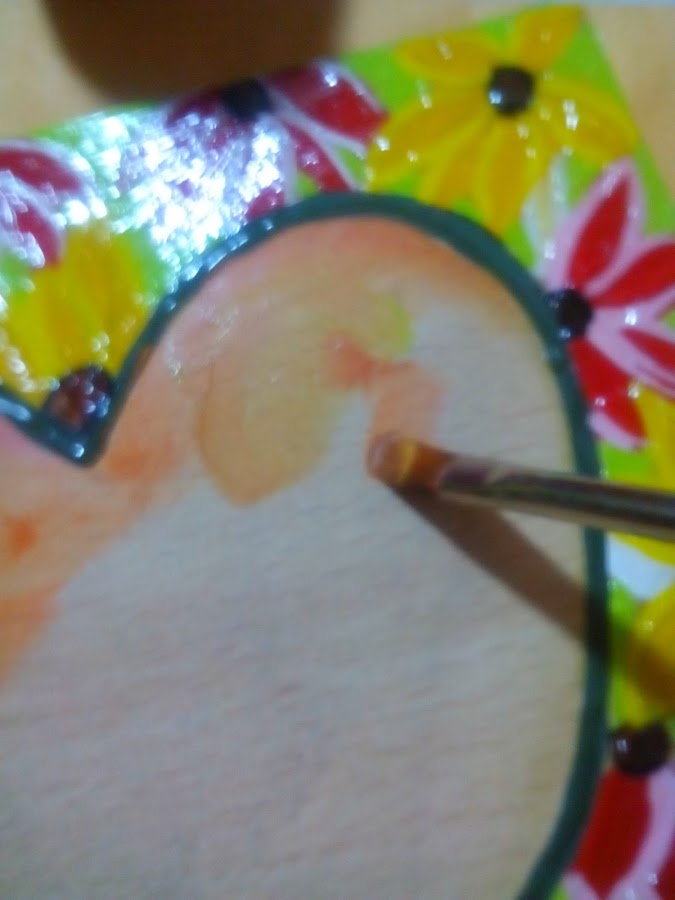 Dentro del corazón he pasado una patina con aguadas de los colores utilizados en las flores