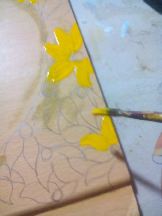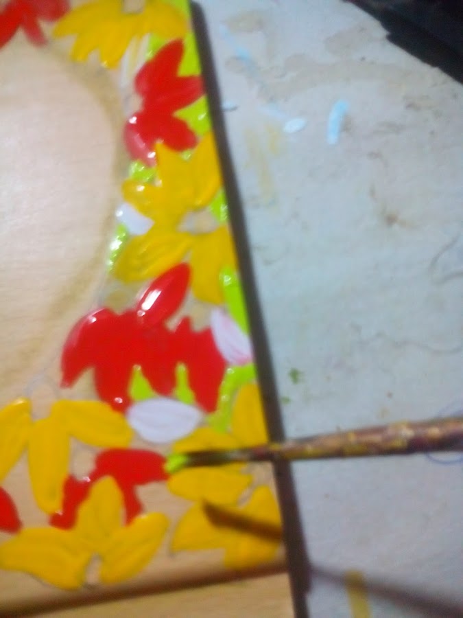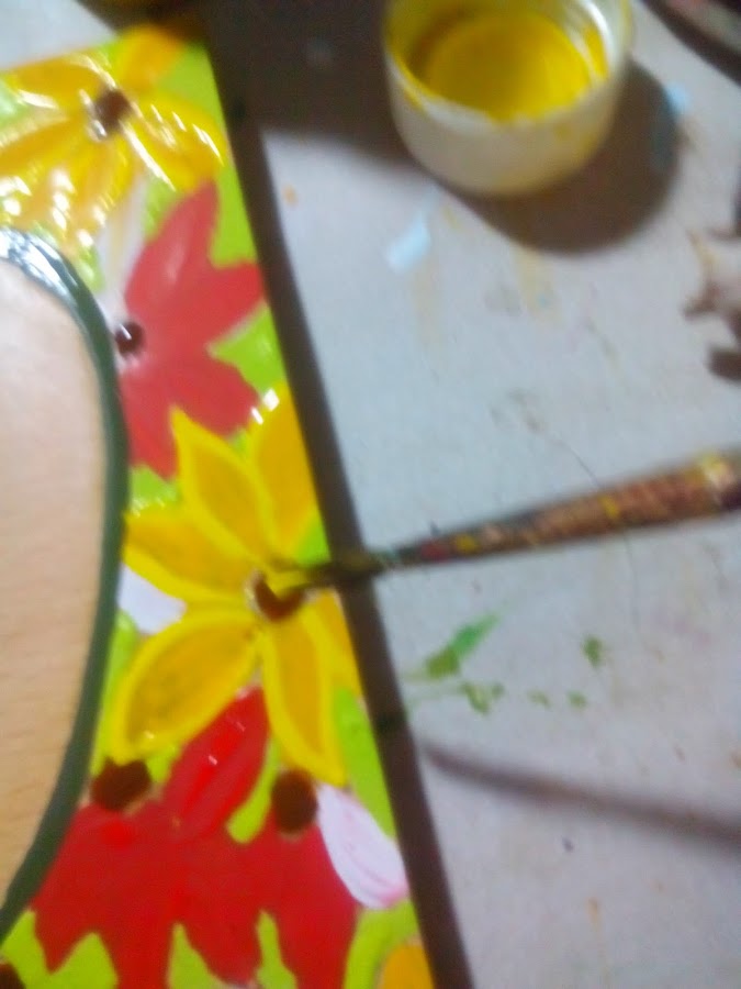Con pincel bien cargado de pintura procedemos a pintar pétalo por pétalo con mucha pintura sin difuminar, para lograr la textura de relieve y aparentar mosaicos.