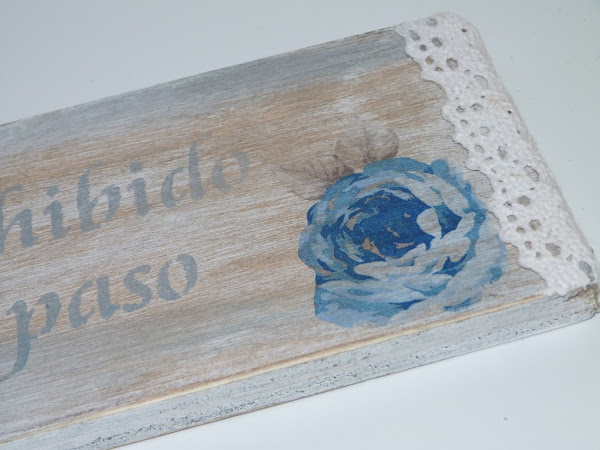Para finalizar, la decoracíón. Decoupage con pequeños motivos, estarcido y unas tiras de puntilla en los extremos para acentuar el aire vintage de los carteles.