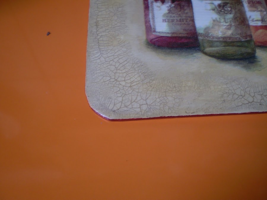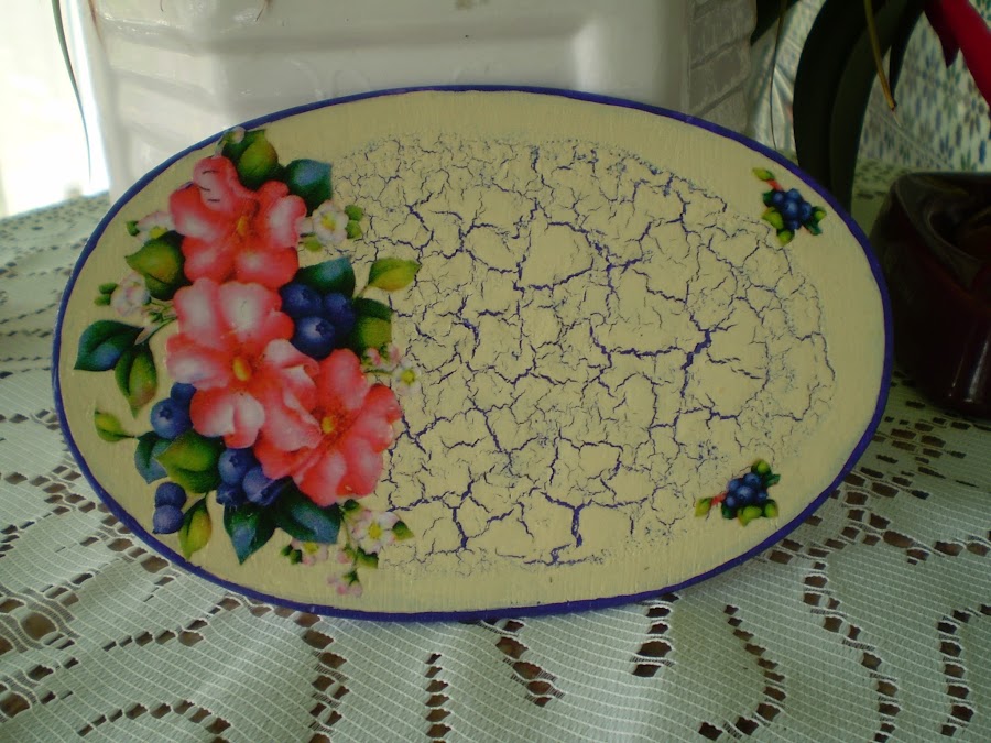 Luego lo pinte de un azul fuerte, deje secar y aplique el craquelador de un paso, en abundancia,que cubriese toda la superficie central, dejando unos 2cm libre en los bordes.