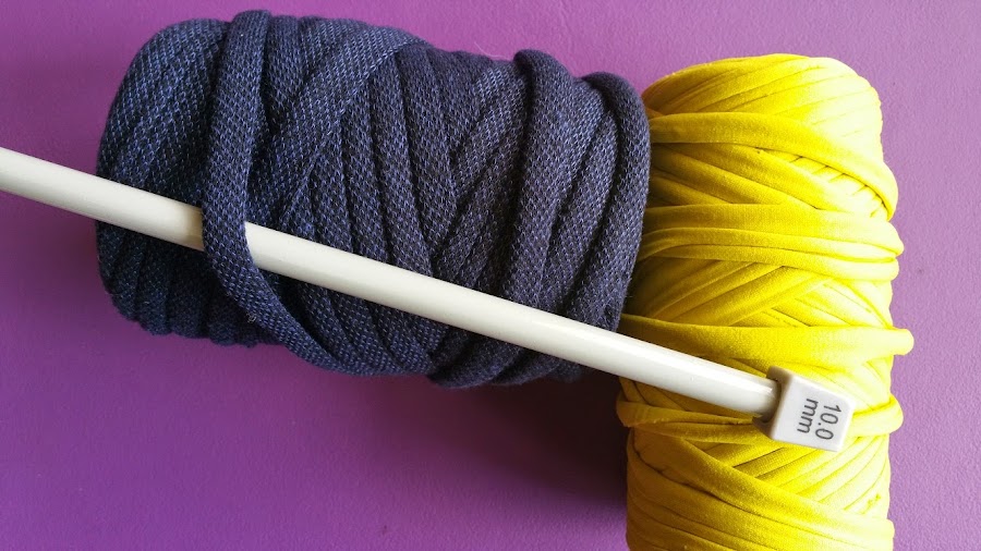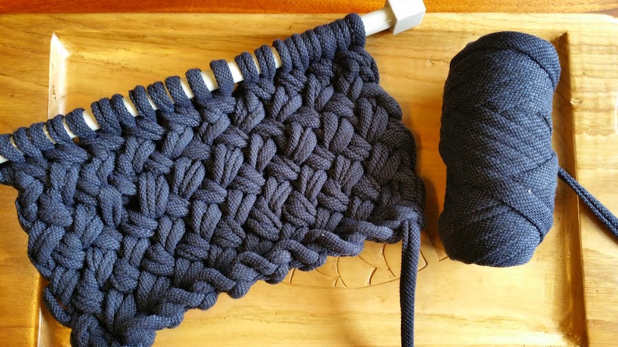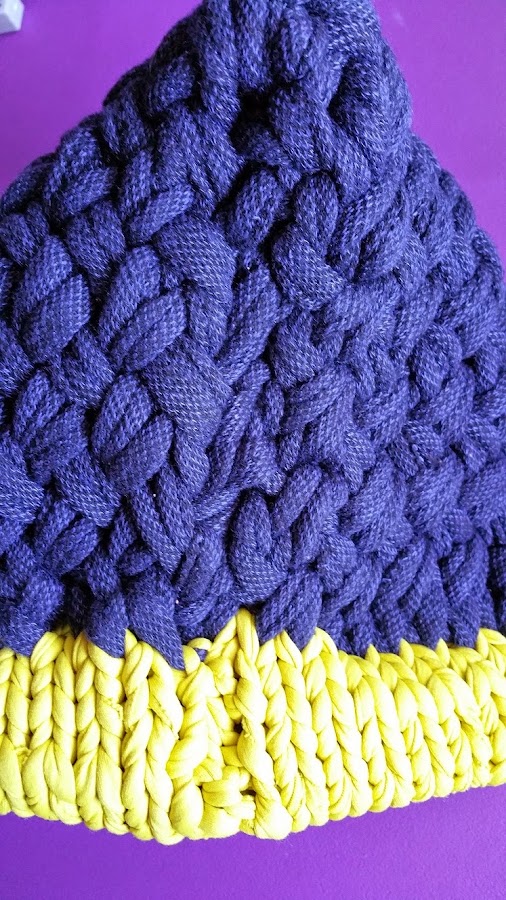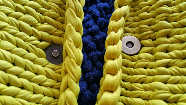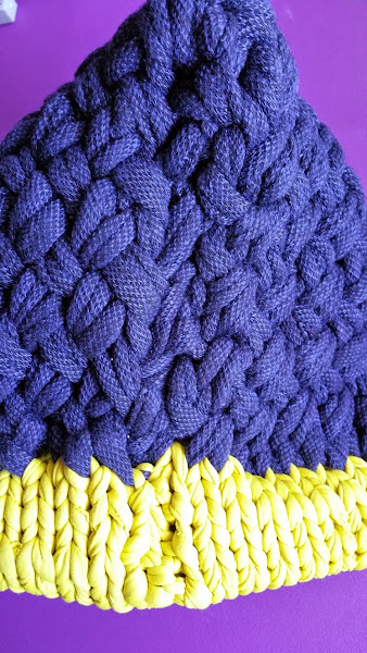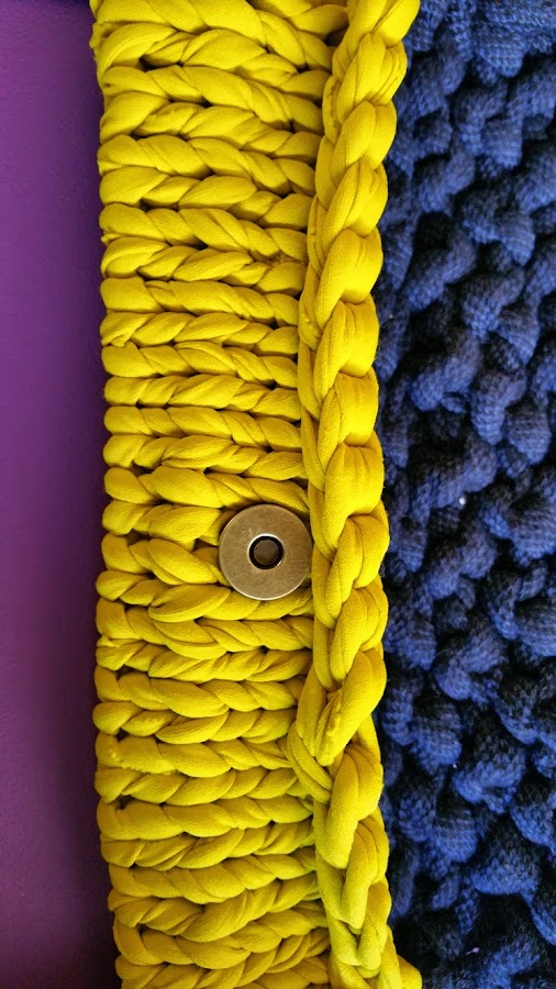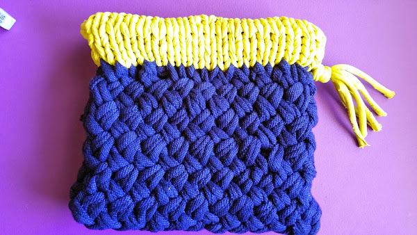 Una cartera de mano con dos grosores de trapillo jugando con el color flúor como contraste del marino, para el color marino he utilizado agujas del Nº 14 y del 10 para el flúor