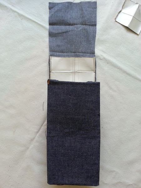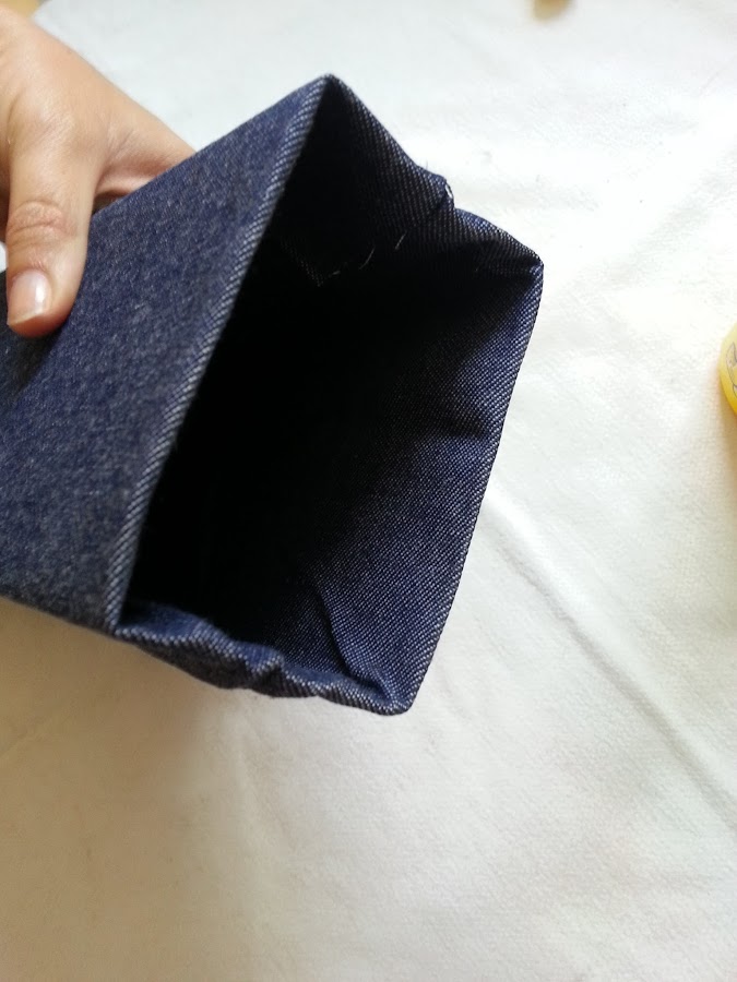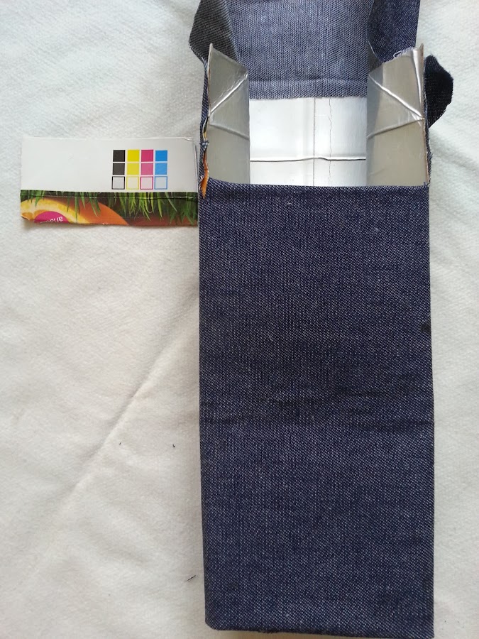 7) En la parte superior del tetrabrik recortaremos la cara delantera y los laterales de forma que la parte de atrás que no cortemos haga de solapa. Introduce como hicimos en el paso 5 la tela hacia adentro y pégala al tetrabrik.