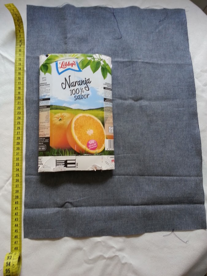 4) Corta la tela con unas medidas de 45cm por 30cm, y pégala recubriendo todo el tetrabrik dejando tela sobrante por arriba y por abajo.