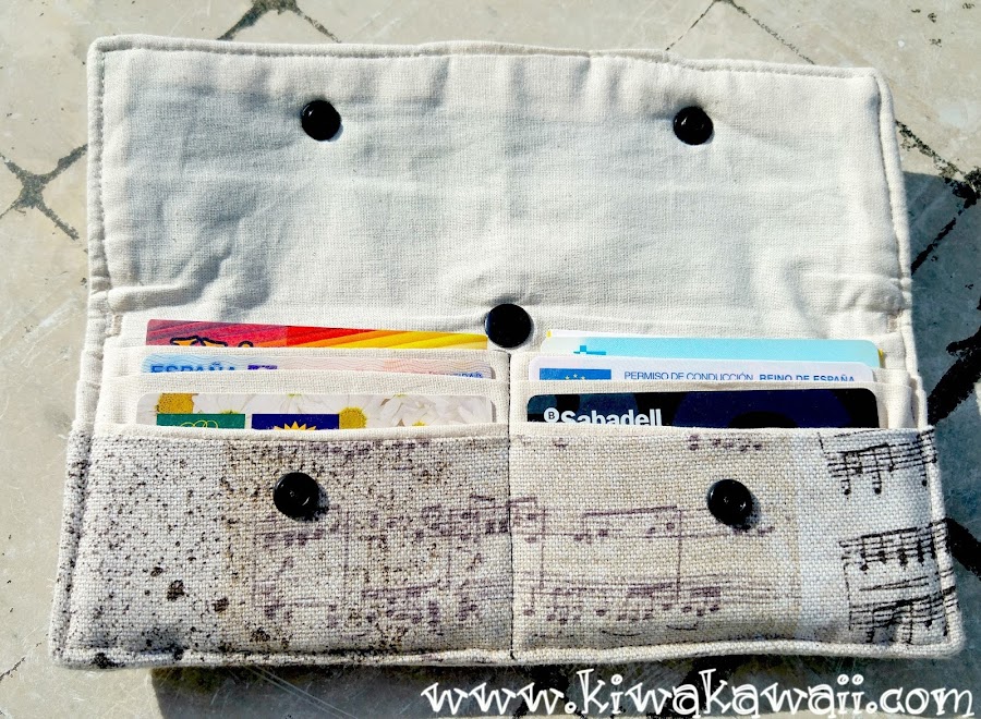 Por el otro lado 6 compartimentos para tarjetas. Cierra con dos snaps, así se distingue rápido qué lado es.