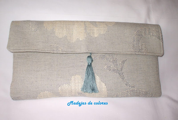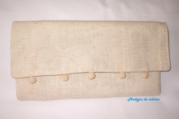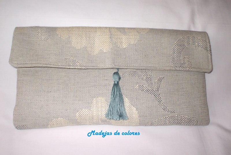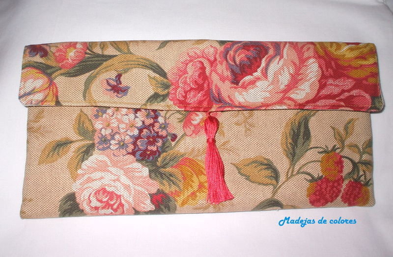 Esta tela me enamoró nada más verla, y enseguida tuve claro que haría una cartera con ella, con ese aire vintage tan bonito, y no fui la única que lo pensó, pues en cuanto la vieron le salieron varias novias, jeje. Como adorno un borlón en color coral.