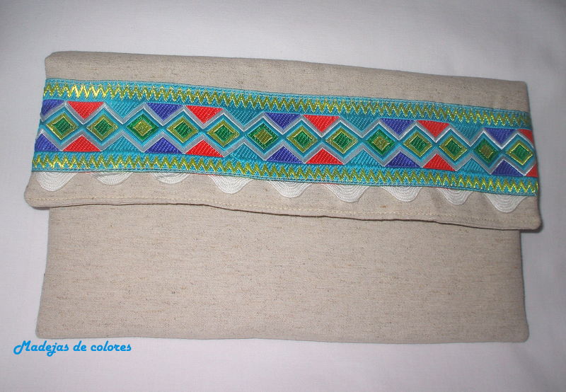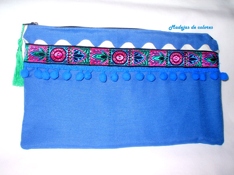 Esta en concreto con tela azul, galón étnico en tonos fucsias, azul, verde y negro, del que asoma una piculina blanca. Debajo le cosí una cinta azul con madroños. De la cremallera le colgué un borlón verde que hice. No hice fotos del interior, pero lleva la misma tela.