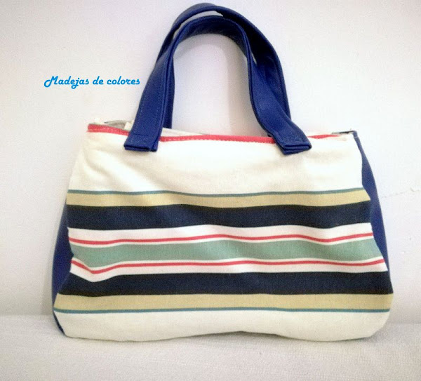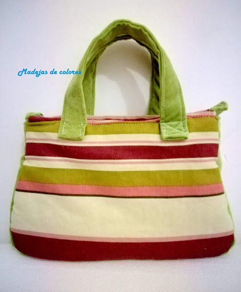 Estrenamos modelo con dos asas de mano. Sobre un blanco roto, listas verde lima, rosas y berenjenas, base, laterales y asas verde con textura empolvada. Cierre con cremallera.