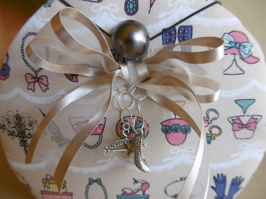 El cierre con goma y un botón, al que habia que quitar la soseria, para ello puse una cadenita con unos charms relacionados con el tema de complementos y un lazo.