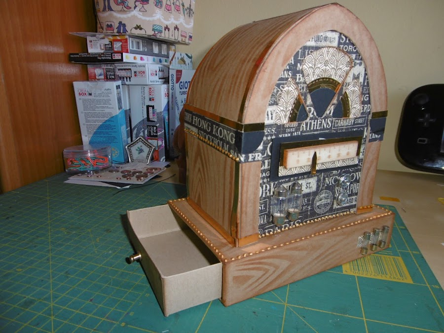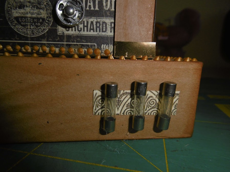 Los detalles metálicos los fui sacando de mis cajones de trastos, encontré unos fusibles que me parecieron ideales, ademas de corchetes, madetitas, papel e ingenio....