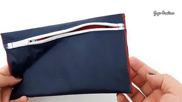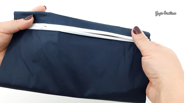 Luego de esto, ponemos de nuevo el estuche del revés, abrimos la cremallera más o menos a la mitad y desplazamos la cremallera un poco hacia abajo, de esta forma: