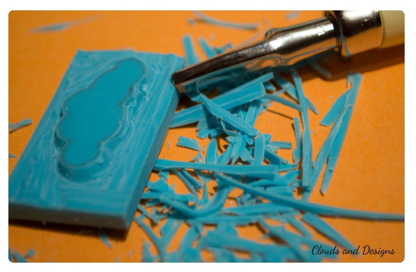 Yo lo que he hecho ha sido dibujar la nubecita tal y como la quería y luego calcarla a la parte de atrás del mismo folio, así obtengo lo que es el revés del dibujo original y lo he redibujado encima del soporte del sello, así de esta manera se plasma el dibujo sin ninguna complicación. (No se si me he explicado bien, pero si hay alguna duda, me preguntas!)