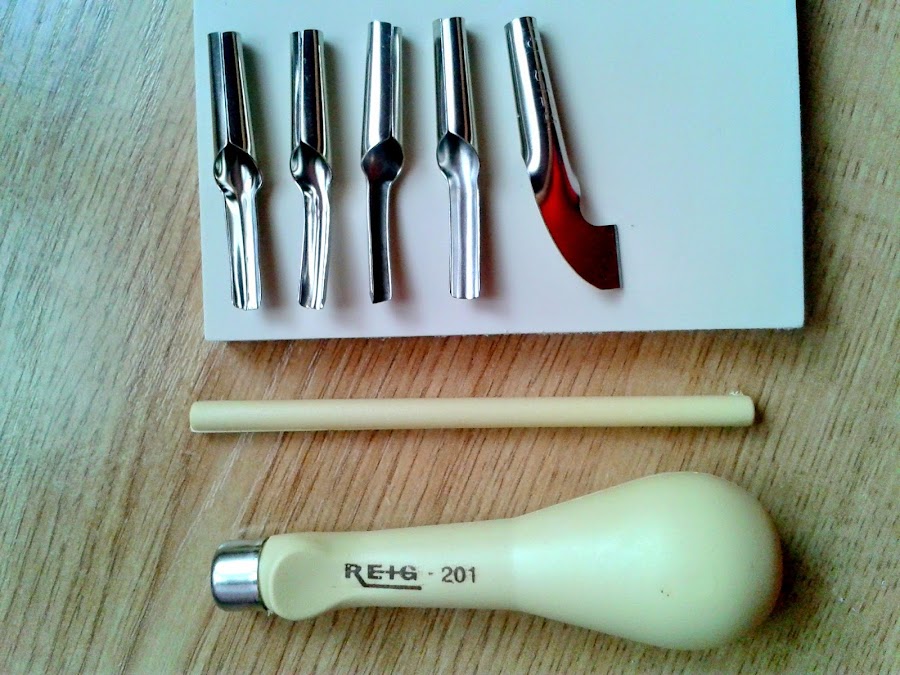 Desde la primera vez que vi que se podían carvar sellos de goma de forma tan sencilla y que tenía tantas utilidades, no me lo podía quitar de la cabeza, hasta que un día aprovechando una visita a una tienda de Bellas Artes para comprar pintura textil, me hice con el material básico para probar a ver qué tal se me daba.