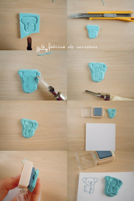 En un papel (de cebolla) se hace el dibujo deseado, y se pone la parte del lápiz sobre la goma. Se aprieta para que se calque el dibujo. Se pasa con cuidado el cúter por la silueta de la figura. A continuación, se van quitando un poco los excesos de goma, llegando al corte que hicimos de la silueta. En este caso, era un koala, así que con cuidado, se le quita la parte central de la nariz, y los ojos. Tras eso, se quitan los restos de goma de alrededor, y... ¡¡Ya tenemos el sello!! En serio, ¿a qué es fácil? Se entinta, y se plasma en el papel. Ya tenemos un koala de andar por casa :)