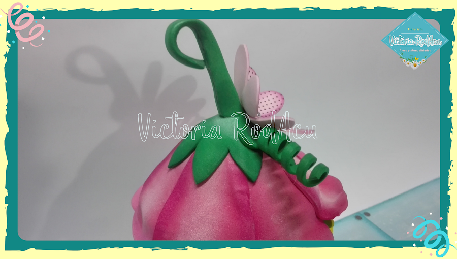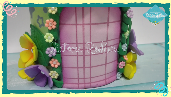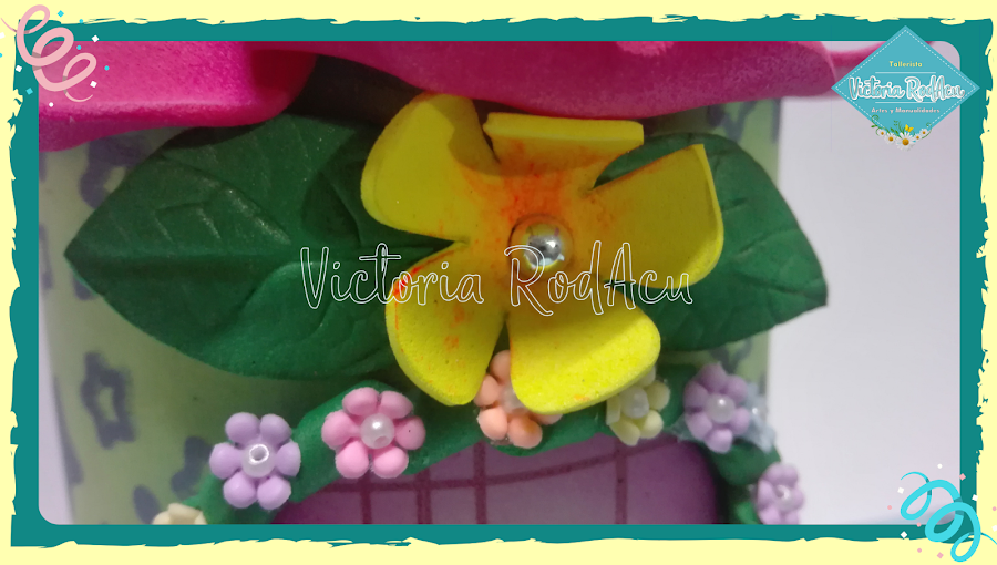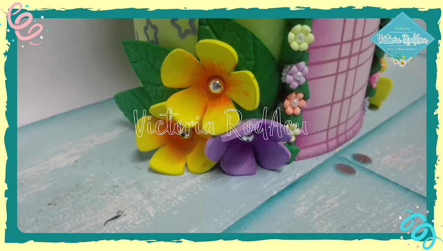 La puerta es la parte central, al rededor de ella haz un adorno con foamy verde y decóralo con pequeñas flores para que tenga un toque más delicado.